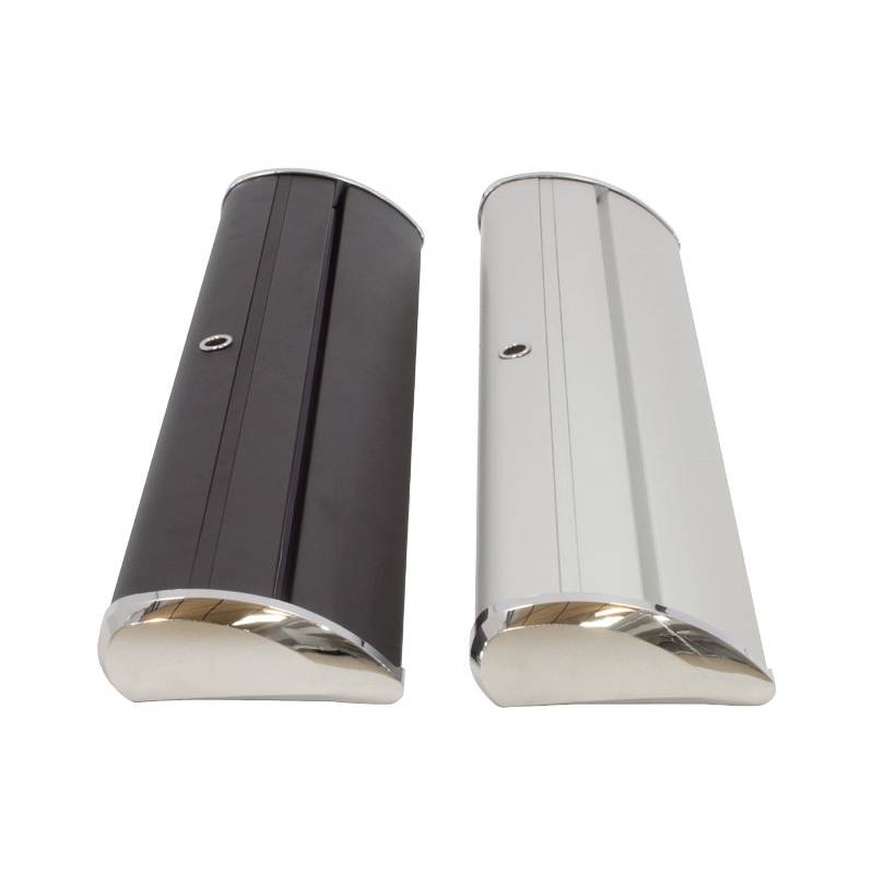 Nuestro Roll Up Premium "numberOne" Dotado con gráfica impresa con alta resolución, lleva en su soporte de aluminio bruto o negro, remates en plata cromo. Inluye macuto de transporte.